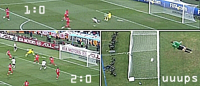 Die Deutschen haben sich nicht nur selbst überrascht sondern auch belohnt. Ein brillianter Özil und selbstbewußter Müller haben mich vor allem überzeugt. In der ersten Halbzeit kommt Deutschland besser ins Spiel als die Engländer. 1:0 Klose. Ja, ja dieser Klose - Gomez ist überwältigt. 2:0 Podlawski, oder Prinz P. Satter Linksschuß inkl. Torwarttunnel nach sehr sehenswertem Spielzug über Müller. Heute ist es wichtig, was ist schon ein verschossener Elfmeter. England pirscht sich ran. Boateng verliert seinen Gegenspieler am Torraum. Neuer kommt raus und springt, aber Upson köpft den Anschlußtreffer für England. Nun scheint alles offen und plötzlich läßt Wembley grüssen. Neuer rettet Lampards Schuss eindeutig hinter der Linie. Schalker Weltklasse! Halbzeit ... (bin aber zu müde weiter zu schreiben) Jetzt geht es weiter. Bilder 1.Halbzeit.