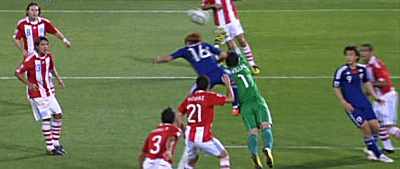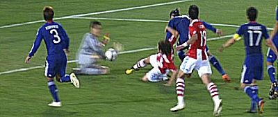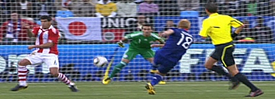 Es ist angerichtet. Das Spiel läuft und Japan schießt bereits nach 20,45 Sekunden aufs Tor. ... Schon 19 Minuten gespielt. Fußball heißt das Spiel und es ist ermüdend. Ich könnte die Partie auch schön reden, aber mir ist nicht danach. Jetzt, ... na Barrios oder Lucas ... Torwart hält! Und auf der anderen Seite trifft Matsui nur die Latte. Aber das zählt halt nichts. Es klappert die Mühle am rauschenden Bach, klipp-klapp... so plätschert das Spiel so vor sich hin. In der 39. Minute zieht Honda direkt nach erfolgtem Zuspiel ab, aber er verfehlt das Tor nur knapp.