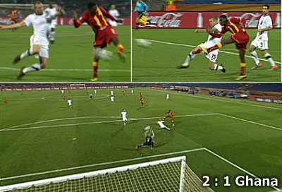 Die Blackstars legen einen Blitzstart hin. Kevin Prince überrascht den amerikanischen Torhüter mit einem trockenem Flachschuß ins kurze Eck. Da ist es - das Ballack-Gedächtnistor. Die US-Boys von der Rolle. Sie kriegen kaum den Ball nach vorne und stehen unsortiert in der Defensive. Ghana ist dem zweiten Tor näher, jedoch die Abschlußschwäche ist nicht zu übersehen. Halbzeit 0:1. Wie so häufig beginnt die 2. Hälfte völlig anders. Die USA nun dominant. Sie wollen einfach ... In Abwesenheit des Ex-Präsidenten Clinton vollendet Donovan in Perfektion den fälligen 11-Meter an den rechten Innenpfosten und TOR! RTL-Kommentator vermutet Clinton auf Toilette. Ich - hinter 'nem Schreibtisch. "I had never sports with this ball." Die USA versäumt es in einem durchschnittlichen Spiel die Entscheidung binnen der 90 Minuten.